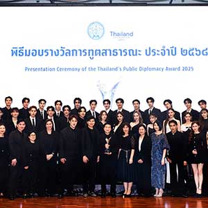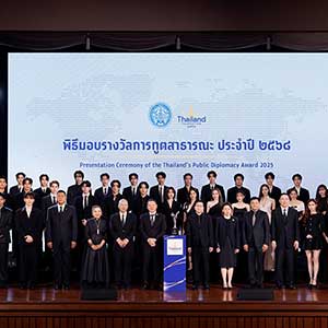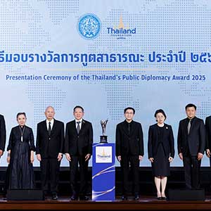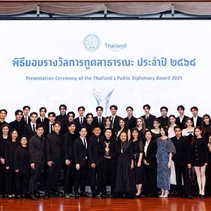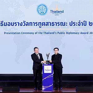 และเข้าสู่ช่วงพิธีการ “คุณธฤต จรุงวัฒน์” เลขาธิการมูลนิธิไทย รายการถึงวัตถุประสงค์ของการมอบรางวัลการทูตสาธารณะ จากนั้น “คุณศรัณย์ เจริญสุวรรณ” เลขานุการรัฐมนตรีว่าการกระทรวงการต่างประเทศ กล่าวเปิดงาน ตามด้วย “คุณธฤต จรุงวัฒน์” เลขาธิการมูลนิธิไทย ประกาศอย่างเป็นทางการว่า “กระทรวงการต่างประเทศและมูลนิธิไทยมีมติมอบรางวัลการทูตสาธารณะ ประจำปี 2568 ให้แก่ บริษัท จีเอ็มเอ็มทีวี จำกัด ในฐานะผู้สร้างสรรค์ผลงานที่เผยแพร่วัฒนธรรมไทยอย่างกว้างขวางบนเวทีโลก” โดยมี “คุณสถาพร พานิชรักษาพงศ์” ประธานเจ้าหน้าที่บริหาร บริษัท จีเอ็มเอ็มทีวี จำกัด เป็นผู้แทนองค์กรขึ้นรับรางวัลจาก “คุณศรัณย์ เจริญสุวรรณ” เลขานุการรัฐมนตรีว่าการกระทรวงการต่างประเทศ ท่ามกลางคณะทูตานุทูต ผู้แทนองค์การระหว่างประเทศ หน่วยงานรัฐ ภาคเอกชน สื่อมวลชน และแขกผู้มีเกียรติที่ร่วมเป็นสักขีพยานอย่างคับคั่ง