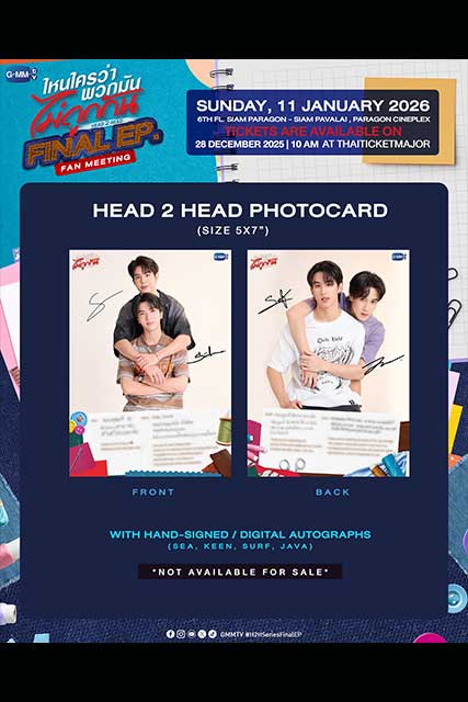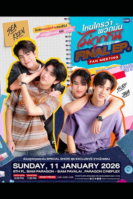 ชวนให้ลุ้นและเอาใจช่วยทุกอีพี กับความสัมพันธ์ที่ถูกลิขิต ที่เกลียดกันมากแค่ไหน ผลักไสกันไปเท่าไหร่ แต่สุดท้ายเกลียดอะไรมันได้อย่างนั้นจริงๆ สำหรับซีรีส์กระแสฮอต “ไหนใครว่าพวกมันไม่ถูกกัน Head 2 Head” ถึงเวลา “ตัวต่อตัว” แพ้ไม่กลัว กลัวไม่มีแฟนครับ จาก “GMMTV” คอนเทนต์โพรไวเดอร์ชั้นนำของ เมืองไทย กับการพบกันของ 2 นักแสดงดาวรุ่งพุ่งแรง “ซี เดชชาติ ทาศิลป์” และ “คีน สุวิจักขณ์ ปิยะนพโรจน์” ล่าสุดเดินทางมาถึงตอนสุดท้าย “ซี-คีน” กอดคอ 2 หนุ่มน้องใหม่สุดปัง “เซิร์ฟ พชร ศิลปสุนทร” และ “จาว่า พบธรรม หรรษา” ชวนแฟนๆ ร่วมรับชมตอนสุดท้าย พร้อมกันในงาน “ไหนใครว่าพวกมันไม่ถูกกัน Final EP. FAN MEETING” ร่วมด้วยผู้กำกับฯ มากฝีมือ “นิว ศิวัจน์ สวัสดิ์มณีกุล” มาร่วมพูดคุยถึงเบื้องหน้าเบื้องหลัง การทำงาน และพิเศษสุดๆ กับสเปเชียลโชว์สุดเอ็กซ์คลูซีฟ จากเหล่านักแสดงที่เตรียมมามอบให้แฟนๆ ได้จับผิด ความน่ารัก พร้อมร่วมพิสูจน์สองความสัมพันธ์ที่ถูกลิขิตมาแล้ว รับรองว่าได้อินและฟินขั้นสุด ในวันอาทิตย์ที่ 11 มกราคม 2569 เวลา 19.30 น. ชั้น 6 สยามพารากอน โรงภาพยนตร์สยามภาวลัย Paragon Cineplex งานฟินๆ เปิดรับปีใหม่ 2569 ที่แฟนๆ ไม่ควรพลาด