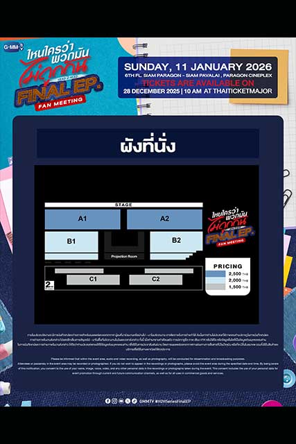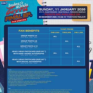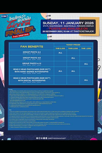 สำหรับผู้ที่สนใจสามารถจองบัตรเข้าร่วมงาน “ไหนใครว่าพวกมันไม่ถูกกัน Final EP. FAN MEETING” เปิดจำหน่ายบัตร ในวันอาทิตย์ที่ 28 ธันวาคมนี้ เริ่มเวลา 10.00 น. เป็นต้นไป บัตรราคา 2,500 / 2,000 / 1,500 บาท ที่ ไทยทิคเก็ตเมเจอร์ทุกสาขา, www.thaiticketmajor.com และ Call center โทร 0-2262-3456 หรือติดตามรายละเอียดเพิ่มเติมได้ที่ www.thaiticketmajor.com และ www.facebook.com/gmmtvofficial / Instagram / X / TikTok / YouTube / Weibo: GMMTV