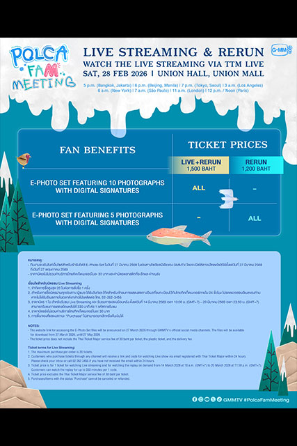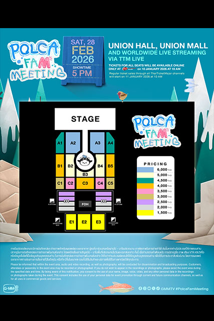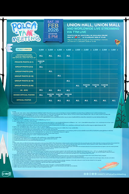 สำหรับผู้สนใจสามารถจับจองบัตรงาน “POLCA FAM MEETING” บนช่องทางออนไลน์ ในวันเสาร์ที่ 10 มกราคม 2569 เริ่มเวลา 10.00 น. เป็นต้นไป เปิดจำหน่ายทุกที่นั่ง ทางออนไลน์ที่ www.thaiticketmajor.com เท่านั้น และ เปิดจำหน่ายบัตร ทุกช่องทางตามปกติ ในวันอาทิตย์ที่ 11 มกราคม 2569 เริ่มเวลา 10.00 น. เป็นต้นไป ทางไทยทิคเก็ตเมเจอร์ทุกสาขา, www.thaiticketmajor.com และ Call center โทร 0-2262-3456 โดยบัตรราคา 6,000 / 5,000 / 4,500 / 4,000 / 3,500 / 3,000 / 2,500 / 2,000 / 1,500 บาท และดูสดผ่าน TTM LIVE บัตรราคา 1,500 / 1,200 บาท (ลิ้งค์และโค้ดรับชม) (กรณีต้องการรับบัตรพลาสติกที่ระลึก ชำระเพิ่ม 30/ใบ) หรือติดตามรายละเอียดเพิ่มเติมได้ที่ www.thaiticketmajor.com หรือ www.facebook.com/gmmtvofficial & Instagram & X & TikTok & YouTube & Weibo : GMMTV