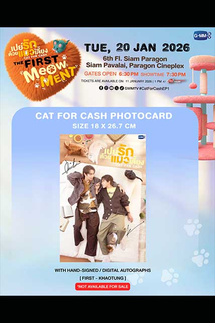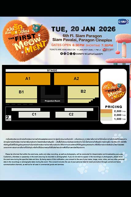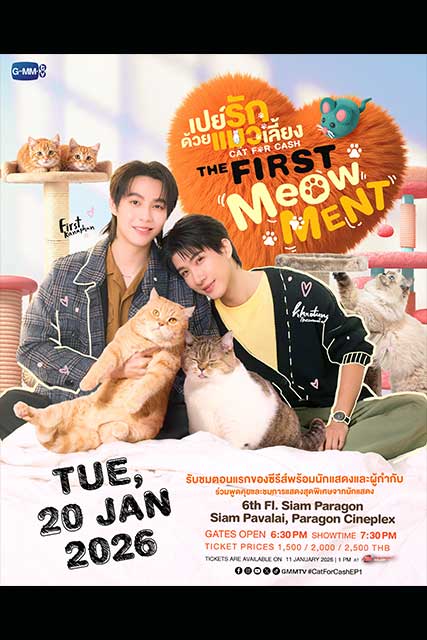 เตรียมตัวอารมณ์ดีประเดิมต้นปีกับซีรีส์สุดน่ารัก “เปย์รักด้วยแมวเลี้ยง” เหนื่อยใจเติมรัก เหนื่อยนัก เติมแมว จาก “GMMTV” คอนเทนต์โพรไวเดอร์ชั้นนำของเมืองไทย ที่พร้อมลงจอให้อบอุ่นหัวใจ กับฝีมือการแสดง ของ 2 คู่ฮอตสุดปัง “เฟิร์ส คณพันธ์ ปุ้ยตระกูล” และ “ข้าวตัง ธนวัฒน์ รัตนกิจไพศาล” ที่จับมือกันเปิดประตู คาเฟ่แมวสุดแปลก อัปเลเวลความเหมียว บอกรักผ่านภาษาแมว ชวนแฟนๆ รับชมตอนแรกพร้อมกัน ในงาน “เปย์รักด้วยแมวเลี้ยง THE FIRST MeOwMENT” พร้อมด้วยผู้กำกับฯ คนเก่ง “กรพรหม นิยมศิลป์” ที่จะ มาร่วมพูดคุยถึงเบื้องหน้าเบื้องหลังการทำงาน และพิเศษสุดๆ กับสเปเชียลโชว์สุดเอ็กซ์คลูซีฟจากเหล่านักแสดงพร้อมโมเมนต์ฟินๆ มามอบให้แฟนๆ แบบเต็มอิ่มสุดๆ ในวันอังคารที่ 20 มกราคม 2569 เวลา 19.30 น. ที่ ชั้น 6 สยามพารากอน - โรงภาพยนตร์สยามภาวลัย Paragon Cineple