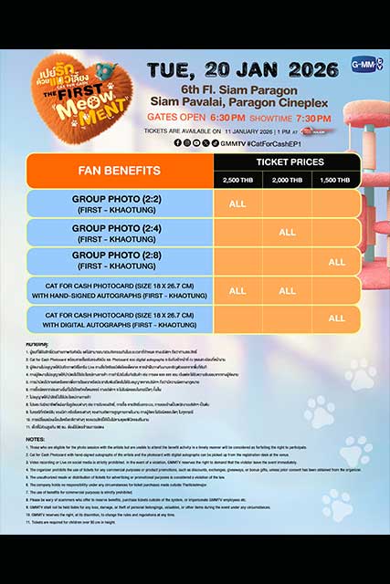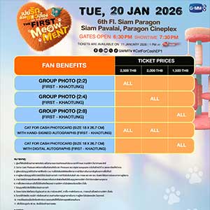 สำหรับผู้ที่สนใจสามารถจองบัตรเข้าร่วมงาน “เปย์รักด้วยแมวเลี้ยง THE FIRST MeOwMENT” เปิดจำหน่ายบัตร วันอาทิตย์ที่ 11 มกราคมนี้ เริ่มเวลา 13.00 น. เป็นต้นไป บัตรราคา 2,500 / 2,000 / 1,500 บาท ที่ ไทยทิคเก็ตเมเจอร์ทุกสาขา, www.thaiticketmajor.com และ Call center โทร 0-2262-3456 หรือติดตามรายละเอียดเพิ่มเติมได้ที่ www.thaiticketmajor.com และ www.facebook.com/gmmtvofficial / Instagram / X / TikTok / YouTube / Weibo: GMMTV