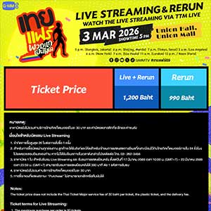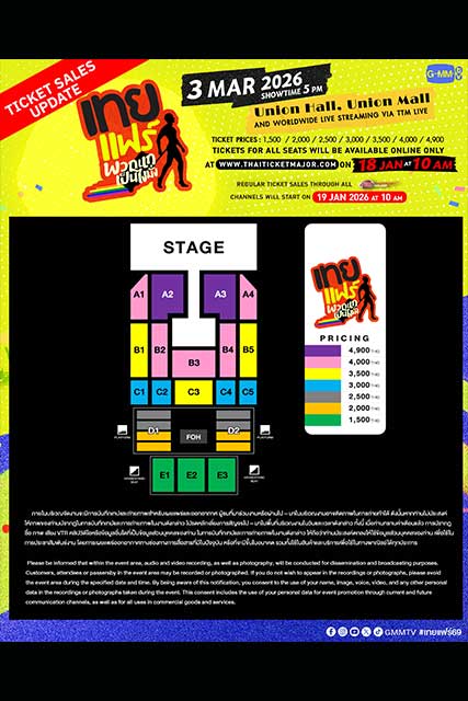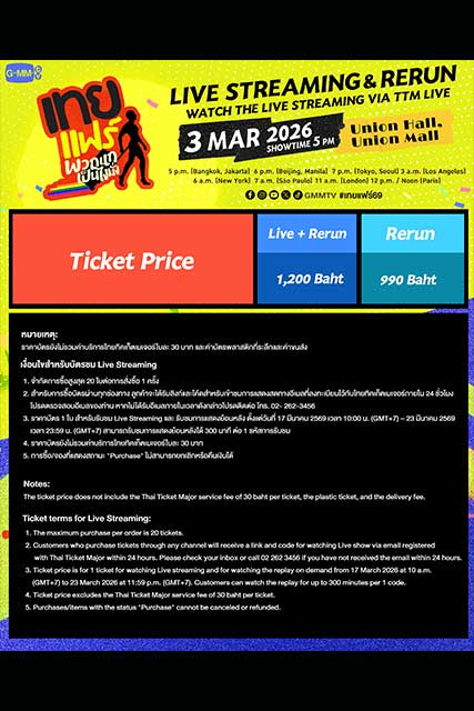 สำหรับผู้สนใจสามารถจับจองบัตรงาน “เทยแฟร์ พวกแกเป็นไงมั่ง” บนช่องทางออนไลน์ ในวันอาทิตย์ที่ 18 มกราคมนี้ เริ่มเวลา 10:00 น. เป็นต้นไป เปิดจำหน่ายทุกที่นั่ง ทางออนไลน์ที่ www.thaiticketmajor.com เท่านั้น และ เปิดจำหน่ายบัตร ทุกช่องทางตามปกติ ในวันจันทร์ที่ 19 มกราคม 2569 เริ่มเวลา 10:00 น. เป็นต้นไป ทางไทยทิคเก็ตเมเจอร์ทุกสาขา, www.thaiticketmajor.com และ Call center โทร 0-2262-3456 โดยบัตรราคา 4,900 / 4,000 / 3,500 / 3,000 / 2,500 / 2,000 / 1,500 บาท และดูสดผ่าน TTM LIVE บัตรราคา 1,200 / 990 บาท (ลิ้งค์และโค้ดรับชม) (กรณีต้องการรับบัตรพลาสติกที่ระลึก ชำระเพิ่ม 30/ใบ) หรือติดตามรายละเอียดเพิ่มเติมได้ที่ www.thaiticketmajor.com หรือ www.facebook.com/gmmtvofficial & Instagram & X & TikTok & YouTube & Weibo : GMMTV #เทยแฟร์69 #GMMTV