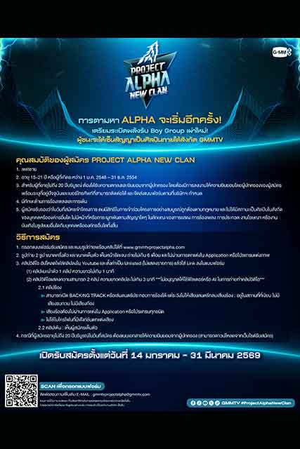 เมืองไทย ประกาศออกตามหา ALPHA อีกครั้ง เตรียมพร้อมระเบิดพลังรับ Boy Group เผ่าใหม่ มาเปล่งประกายในวงการ T-POP กับ “PROJECT ALPHA NEW CLAN” สุดยอดโปรเจกต์ที่จะค้นหาเหล่า ALPHA ที่มีความฝันและความสามารถทั้งการร้องและเต้น เพื่อจะได้เซ็นสัญญาเป็นศิลปินภายใต้สังกัด “GMMTV” หลังประสบความสำเร็จอย่างมาก กับ 5 หนุ่ม ALPHA รุ่นพี่ ที่ปัจจุบันกลายเป็น Boy Group แถวหน้าของเมืองไทยอย่าง “LYKN” ประกอบด้วย “วิลเลี่ยม-เลโก้-นัท-ฮง-ตุ้ย” ซึ่งผู้ที่สนใจสมัครเข้าร่วมโครงการจะต้องผ่านการออดิชั่น และจะได้รับการฝึกฝนทักษะทั้งการร้องและเต้นอย่างเข้มข้น ในฐานะ TRAINEE โดยมีคุณสมบัติดังนี้ เพศชาย อายุระหว่าง 15-21 ปี หรือ ผู้ที่เกิดระหว่าง 1 ม.ค. 2548 – 31 ธ.ค. 2554 สำหรับผู้ที่อายุไม่ถึง 20 ปีบริบูรณ์ ต้องได้รับความตกลงและยินยอมจากผู้ปกครอง โดยต้องมีการลงนามจริงให้ความยินยอมโดยผู้ปกครองของผู้สมัคร พร้อมระบุที่อยู่ปัจจุบันและเบอร์โทรศัพท์ที่สามารถติดต่อได้ พร้อมทั้งมีทักษะด้านการร้องและการเต้น เพื่อคว้าโอกาสได้ก้าวสู่การเป็นศิลปินภายในสังกัด “GMMTV” และไม่ได้มีสถานะเป็นศิลปินภายใดสังกัดบุคคลหรือองค์กรใดทั้งสิ้น ซึ่งใครที่มั่นใจว่ามีคุณสมบัติดังกล่าว สามารถส่งคลิปแนะนำตัวความยาวไม่เกิน 1 นาที, คลิปร้องเพลง จำนวน 1 คลิป และคลิปเต้น (เห็นเต็มตัว) จำนวน 1 คลิป โดยความยาวคลิปละไม่เกิน 3 นาที (ไม่อนุญาตให้ใช้ฟิลเตอร์หรือ AI ในการถ่ายทำคลิปวิดีโอ) พร้อมแนบรูปถ่าย 2 รูป ขนาดครึ่งตัวและเต็ม เห็นใบหน้าชัดเจน ถ่ายไม่เกิน 6 เดือน (ไม่ผ่านการตกแต่งใน Application หรือโปรแกรมภาพ) โดยจะเปิดรับสมัครผ่านทาง www.gmmtvprojectalpha.com ฟรี! ไม่เสียค่าใช้จ่ายในการสมัคร และร่วมโครงการไม่ว่ากรณีใด ทั้งสิ้น โปรดระวังมิจฉาชีพที่แฝงมาในรูปแบบต่าง ๆ เช่น การแอบอ้างเป็นพนักงานบริษัทฯ เป็นต้น ผู้ที่สนใจเข้าร่วม “PROJECT ALPHA NEW CLAN” สามารถเข้าไปกรอกใบสมัคร พร้อมแนบรูปถ่ายพร้อมคลิปได้แล้ววันนี้ – 31 มีนาคม 2569 หรือสอบถามรายละเอียดเพิ่มเติมได้ที่ : Email: gmmtvprojectalpha@gmm-tv.com (จันทร์ถึงศุกร์ 10.00-15.00 น. ยกเว้นวันหยุด/ วันหยุดนักขัตฤกษ์)