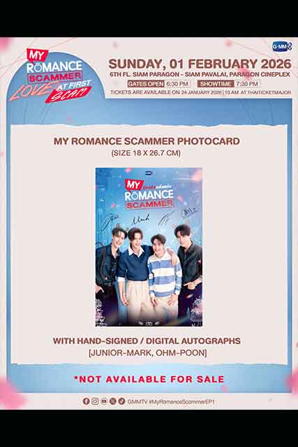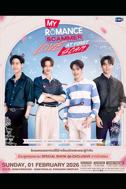 เตรียมรับมือกับชาวแแก๊ง Scammer ที่จะมาหลอกให้รักแบบหัวปักหัวปำ กับซีรีส์โรแมนติกคอมเมดี้ อารมณ์ดีรักกันทั้งเรื่อง “My Romance Scammer รักจริง หลังแต่ง” เข้าหาเพื่อหลอกล่อ อยู่ต่อเพราะรักแล้ว จาก “GMMTV” คอนเทนต์โพรไวเดอร์ชั้นนำของเมืองไทย พร้อมลงจอให้อิน ไปจับผิดกับโมเมนต์เบื้องหน้า ทำไม่สนใจ แต่เบื้องหลังรักกันมาก จากฝีมือการแสดงของคู่ฮอตเคมีสุดปัง “จูเนียร์ ปณชัย ศรีอาริยะรุ่งเรือง” และ “มาร์ค จิรันธนิน ตรัยรัตนยนต์” ที่กอดคอ 2 หนุ่มกระแสแรง “โอห์ม ฐิติวัฒน์ ฤทธิ์ประเสริฐ” และ “ปูน มิตรภักดี” ชวนแฟนๆ จับตาจับผิดจับโป๊ะร่วมชมตอนแรกพร้อมกัน ในงาน “My Romance Scammer : Love at First Scam” ร่วมด้วยผู้กำกับฯ คนเก่ง “ศิวัจน์ สวัสดิ์มณีกุล” ที่จะมาร่วมพูดคุยถึงเบื้องหน้าเบื้องหลังการทำงาน และพิเศษสุดๆ กับสเปเชียลโชว์สุดเอ็กซ์คลูซีฟจากเหล่านักแสดง พร้อมโมเมนต์ฟินๆ มามอบให้แฟนๆ แบบเต็มอิ่ม ในวันอาทิตย์ที่ 1 กุมภาพันธ์ 2569 เวลา 19.30 น. ที่ ชั้น 6 สยามพารากอน โรงภาพยนตร์สยามภาวลัย Paragon Cineplex งานนี้บอกเลยพลาดไม่ได้จริงๆ