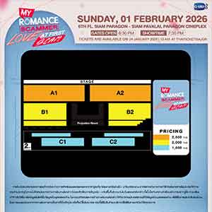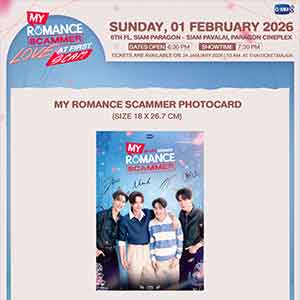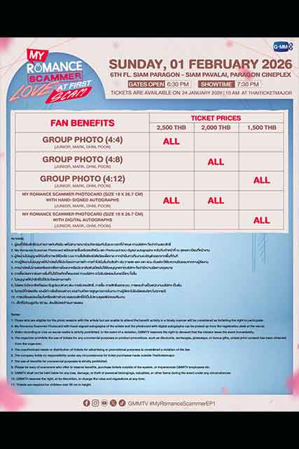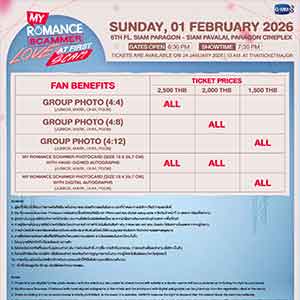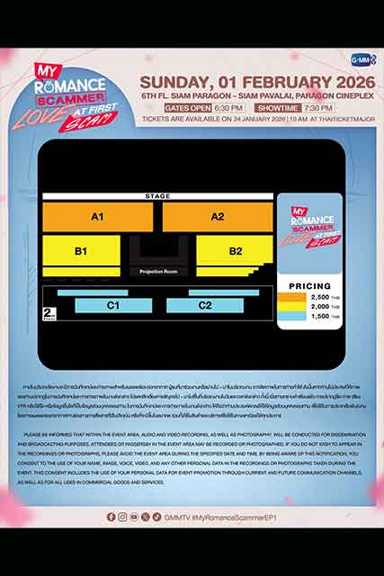 สำหรับผู้ที่สนใจสามารถจองบัตรเข้าร่วมงาน “My Romance Scammer : Love at First Scam” เปิดจำหน่ายบัตร วันอาทิตย์ที่ 24 มกราคมนี้ เริ่มเวลา 10.00 น. เป็นต้นไป บัตรราคา 2,500 / 2,000 / 1,500 บาท ที่ ไทยทิคเก็ตเมเจอร์ทุกสาขา, www.thaiticketmajor.com และ Call center โทร 0-2262-3456 หรือติดตามรายละเอียดเพิ่มเติมได้ที่ www.thaiticketmajor.com และ Facebook / Instagram / X / TikTok / YouTube / Weibo: GMMTV