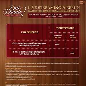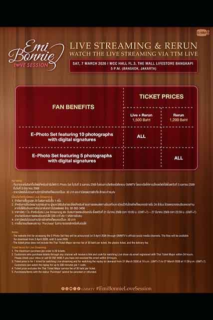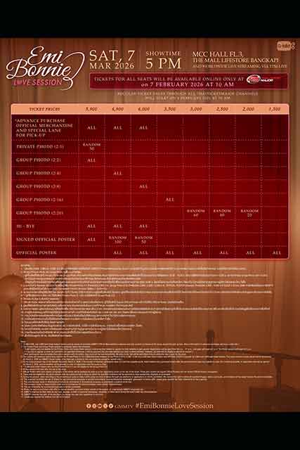 สามารถซื้อบัตรงาน “EMI BONNIE : LOVE SESSION” โดยจะเปิดจำหน่ายบัตรบนช่องทาง Online ในวันเสาร์ที่ 7 กุมภาพันธ์นี้ ทาง www.thaiticketmajor.com เท่านั้น เวลา 10.00 น. เป็นต้นไป และจะเปิดจำหน่ายบัตรทุกช่องทางตามปกติ ในวันอาทิตย์ที่ 8 กุมภาพันธ์ 2569 เวลา 10.00 น. เป็นต้นไป ทางไทยทิคเก็ตเมเจอร์ทุกสาขา, www.thaiticketmajor.com และ Call center โทร 0-2262-3456 บัตรราคา 5,900 / 4,900 / 4,000 / 3,500 / 3,000 / 2,500 / 2,000 / 1,500 บาท และดูสดผ่าน “TTM LIVE” บัตรราคา 1,500 / 1,200 บาท (ลิงค์และโค้ดรับชม) (กรณีต้องการรับบัตรพลาสติกที่ระลึก ชำระเพิ่ม 30/ใบ) และติดตามรายละเอียดเพิ่มเติมได้ที่ www.thaiticketmajor.com และ www.facebook.com/gmmtvofficial / Instagram / X / TikTok / YouTube / Weibo: GMMTV
