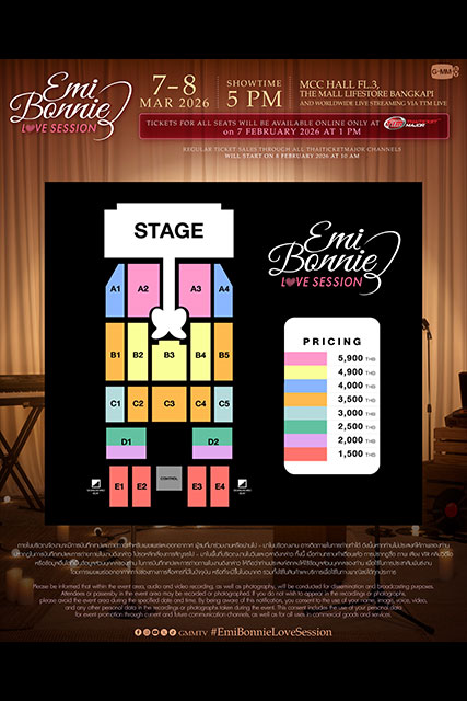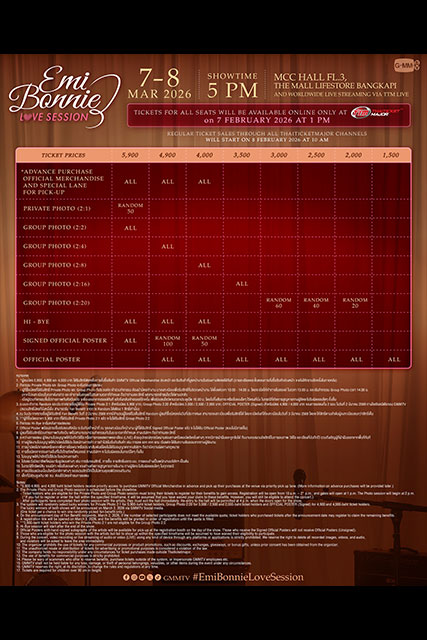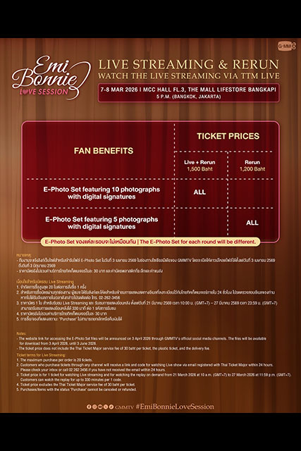 SESSION” โดยจะเปิดจำหน่ายบัตรบนช่องทาง Online ในวันเสาร์ที่ 7 กุมภาพันธ์นี้ ทาง www.thaiticketmajor.com เท่านั้น เวลา 13.00 น. เป็นต้นไป และเปิดจำหน่ายบัตรทุกช่องทางตามปกติ ในวันอาทิตย์ที่ 8 กุมภาพันธ์ 2569 เวลา 10.00 น. เป็นต้นไป ทางไทยทิคเก็ตเมเจอร์ทุกสาขา, www.thaiticketmajor.com และ Call center โทร 0-2262-3456 บัตรราคา 5,900 / 4,900 / 4,000 / 3,500 / 3,000 / 2,500 / 2,000 / 1,500 บาท และดูสดผ่าน “TTM LIVE” บัตรราคา 1,500 / 1,200 บาท (ลิงค์และโค้ดรับชม) (กรณีต้องการรับบัตรพลาสติกที่ระลึก ชำระเพิ่ม 30/ใบ) และติดตามรายละเอียดเพิ่มเติมได้ที่ www.thaiticketmajor.com และ http://www.facebook.com/gmmtvofficial / Instagram / X / TikTok / YouTube / Weibo: GMMTV
