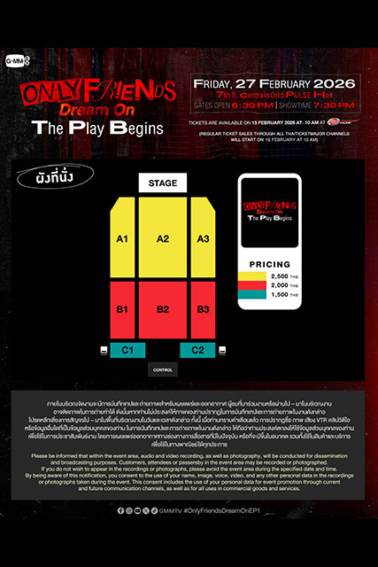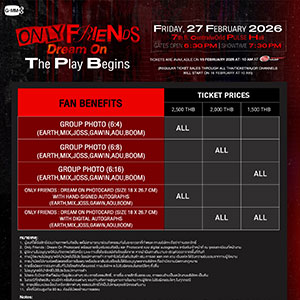 สำหรับผู้ที่สนใจสามารถจับจองบัตรเข้าร่วมงาน “Only Friends Dream On : The Play Begins” โดยเปิดจำหน่ายบัตร บนช่องทาง Online ในวันอาทิตย์ที่ 15 กุมภาพันธ์นี้ เริ่มเวลา 10.00 น. เป็นต้นไป และทุกช่องทางตามปกติ ในวันจันทร์ที่ 16 กุมภาพันธ์นี้ เริ่มเวลา 10.00 น. เป็นต้นไป บัตรราคา 2,500 / 2,000 / 1,500 บาท ที่ไทยทิคเก็ตเมเจอร์ทุกสาขา, www.thaiticketmajor.com และ Call Center โทร 0-2262-3456 ติดตามรายละเอียดเพิ่มเติมได้ที่เว็บไซต์ : www.thaiticketmajor.com และ www.facebook.com/gmmtvofficial / Instagram / X / TikTok / YouTube / Weibo: GMMTV