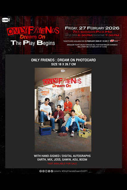 เตรียมเปิดม่านการแสดงกับโปรเจกต์ละครเวทีคณะจาก 6 หนุ่มฮอตสุดแซ่บ “เอิร์ท พิรพัฒน์ วัฒนเศรษสิริ, มิกซ์ สหภาพ วงศ์ราษฎร์, จอส เวอาห์ แสงเงิน, กวิน แคสกี้, อู๋ ธนบูรณ์ เกียรตินิรันดร์, บูม ธราธร จันทรวรกาญจน์” ที่แท็กทีมกันอย่างแซ่บซี๊ดถึงใจ รวมถึงถ่ายทอดความสัมพันธ์รักสุดเร่าร้อนที่ 6 หนุ่มขอเปิดเวทีครั้งใหญ่ชวนแฟนๆ มาสร้างโมเมนต์สุดพิเศษร่วมกัน พร้อมกับร่วมดูตอนแรกซีรีส์ “Only Friends : Dream On” เล่นกับเพื่อนได้...มากกว่าเพื่อน จาก “GMMTV” คอนเทนต์โพรไวเดอร์ชั้นนำของเมืองไทย ร่วมด้วยผู้กำกับฯ คุณภาพ “ภิญญา จู่คำศรี” ที่จะมาร่วมพูดคุยถึงเบื้องลึกเบื้องหลัง ฉากแซ่บ ซีนหวานในซีรีส์กันแบบถึงพริกถึงขิง พร้อมชม Special Show สุด Exclusive จากเหล่านักแสดงที่เตรียมมามอบความสุขให้แฟนๆ ได้ฟินกันเต็มอิ่มทุกโมเมนต์ กับงาน “Only Friends Dream On : The Play Begins” ในวันศุกร์ที่ 27 กุมภาพันธ์นี้ เวลา 19.30 น. เป็นต้นไป ณ CentralwOrld PULSE Hall ชั้น 7 ศูนย์การค้าเซ็นทรัลเวิลด์ งานนี้แฟนๆ เตรียมตัวล็อคคิวกดบัตรรับความสนุกครบรสกันได้เลย