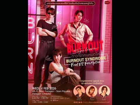 “ออฟ-กัน-ดิว” กอดคอแก๊งคนหมดไฟร่วมเปิดบาร์ครั้งสุดท้าย ลุ้นความสัมพันธ์ตอนจบซีรีส์ “Burnout Syndrome ภาวะรักคนหมดไฟ” ในงาน “Burnout Syndrome Final EP. FAN MEETING” พร้อมกดบัตร 25 มกราคมนี้